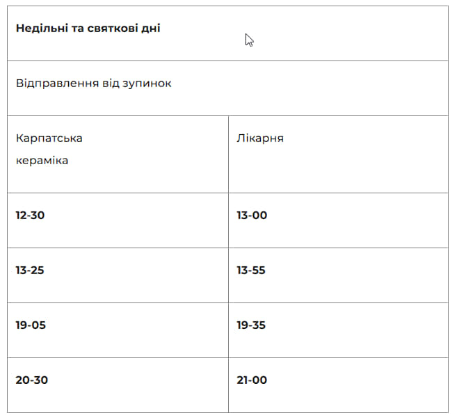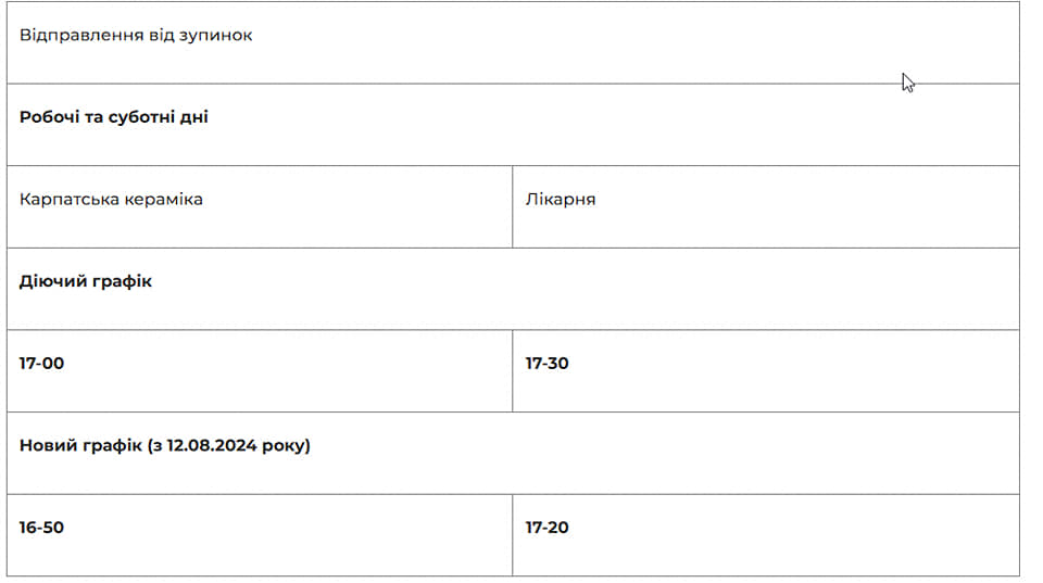 Також, з 12.08.2024 року в робочі та суботні дні буде змінено графік руху автобуса, що здійснює безоплатне перевезення пенсіонерів за віком та осіб з інвалідністю ІІІ групи (пільговий) за маршрутом № 6 А «Карпатська кераміка – Лікарня» по пр.Лесі Українки.