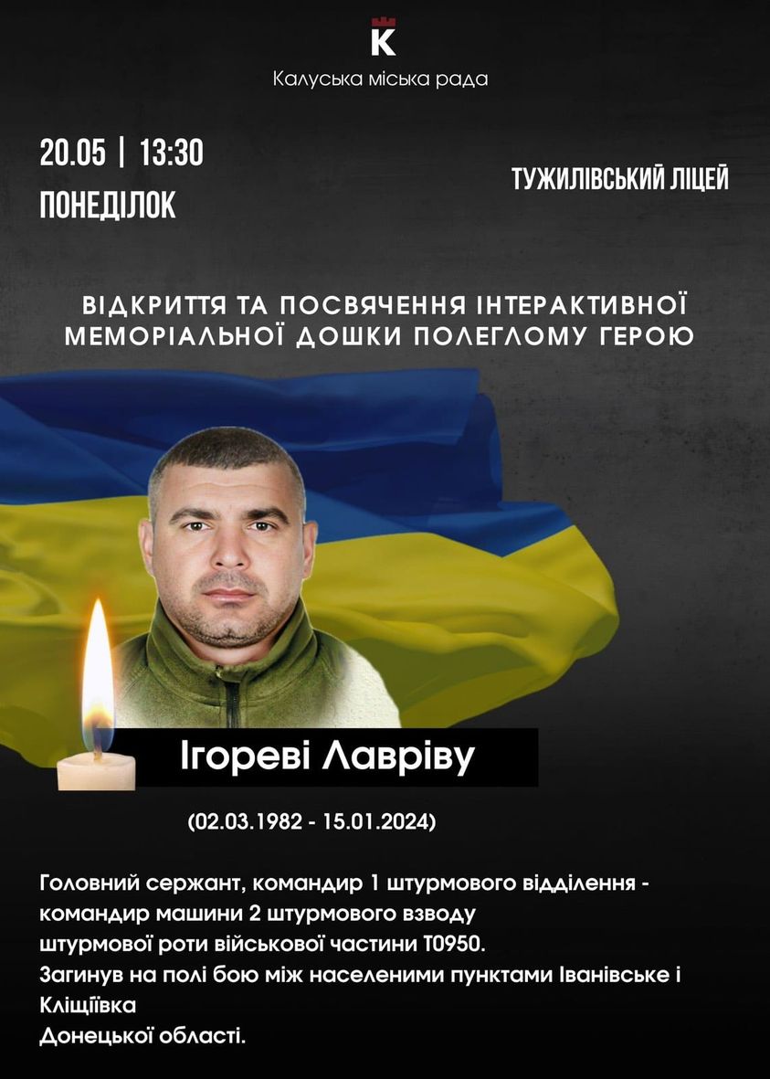 Пам’ятну дошку Ігореві Лавріву встановлять на фасаді Тужилівського ліцею. Відкриття розпочнеться о 13:30.