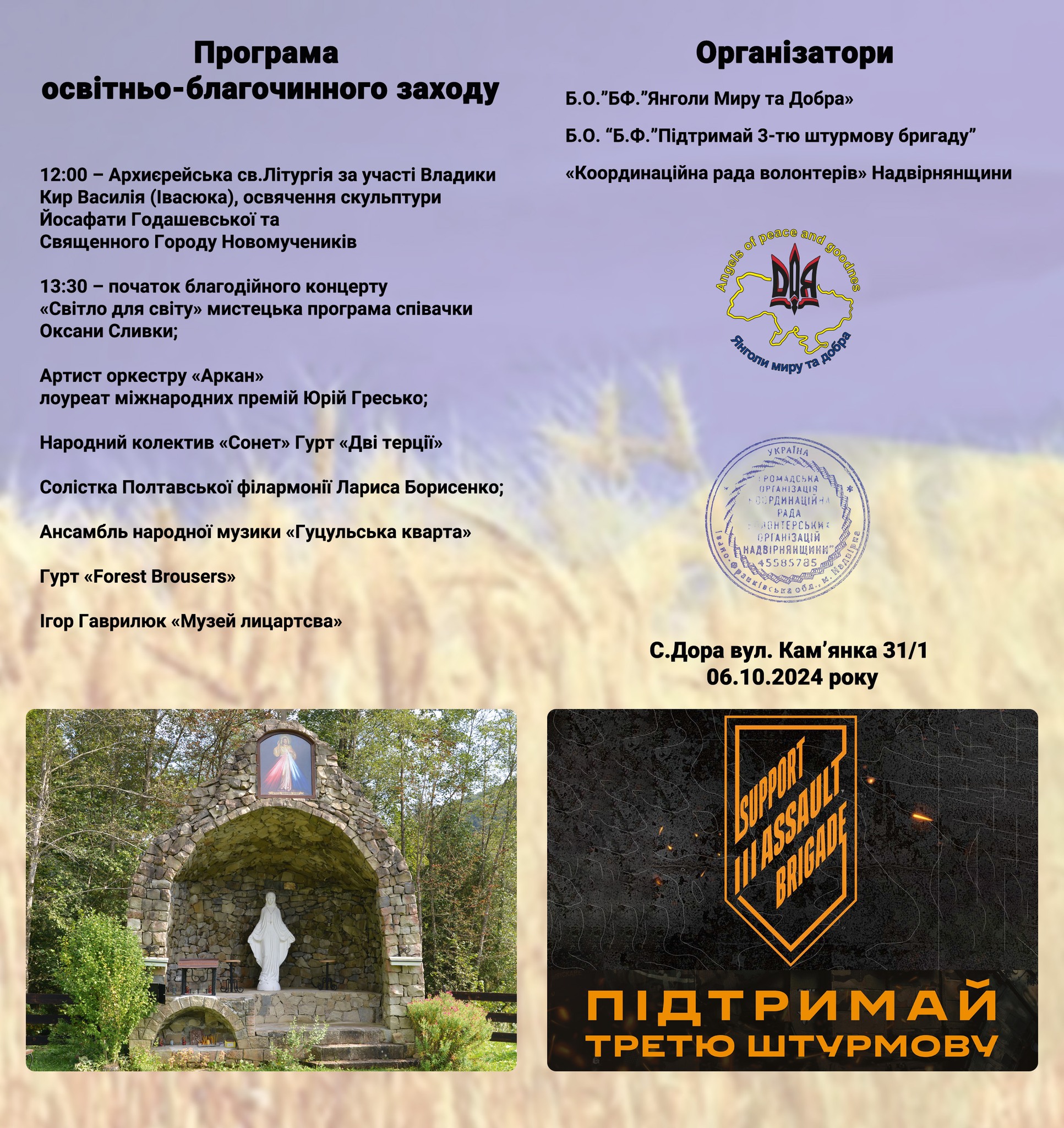 6 жовтня 2024 року Б., у м. Яремче (Дора) на вул. Камʼянка 31/1, відбудеться освітньо-благочинний захід, під час якого Преосвященний владика Василій Івасюк, єпарх Коломийський, освятить скульптуру Йосафати Гордашевської та Священний Город Новомучеників.