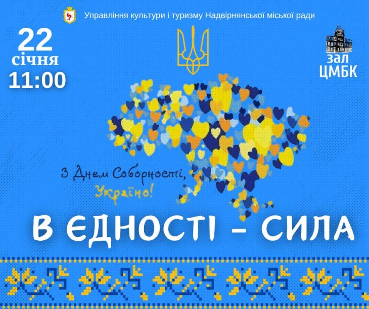 Сьогодні 22 січня, о 11:00 год в Надвірнянському центральному міському будинку культури відбудуться урочистості з нагоди Дня Соборності України!