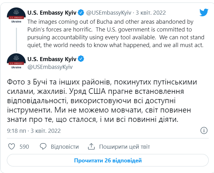 Посольство Сполучених Штатів в Україні прокоментувало воєнні злочини російських окупантів у Бучі та інших звільнених містах на Київщині.