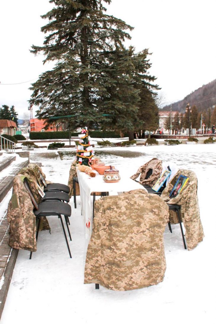 На площі встановили порожні стільці з військовою формою. Вони символізували вільні місця за різдвяним столом захисників, на яких чекають удома.
