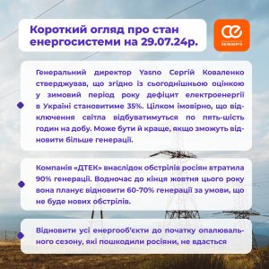 Короткий огляд про стан енергосистеми станом на 29.07.2024р.