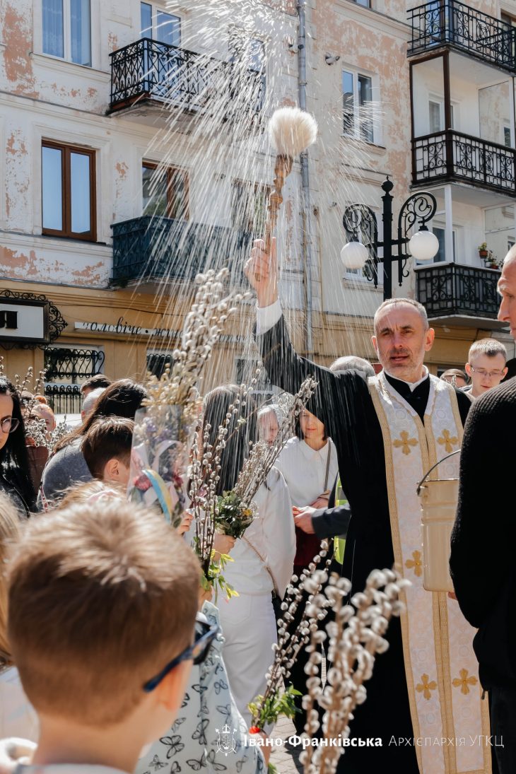 Згодом духовенство та вірні вирушили на площу Митрополита Андрея Шептицького, де Єпископи спільно зі священнослужителями освятили вербове віття та привітали чисельно зібраних мирян із світлим празником.