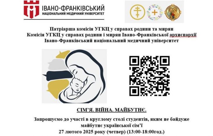 У четвер, 27 лютого, у приміщенні Івано-Франківського національного медичного університету відбудеться круглий стіл на тему «Сім’я. Війна. Майбутнє» для студентів, яким не байдуже майбутнє української сім’ї.