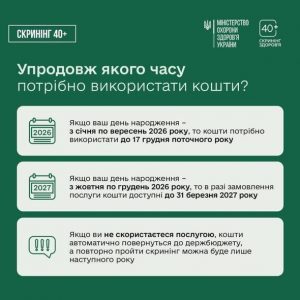 Детальну інформацію про програму Скринінг здоров’я 40+ та відповіді на найпоширеніші запитання можна знайти також за посиланням: https://screening.moz.gov.ua/