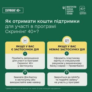 Запрошення на скринінг надходитиме в застосунок Дія на 30-й день після дня народження — для людей віком від 40 років і більше. Після підтвердження участі в програмі 2000 гривень зараховуються на Дія. Картку протягом семи днів. Кошти можна використати виключно для оплати скринінгу.