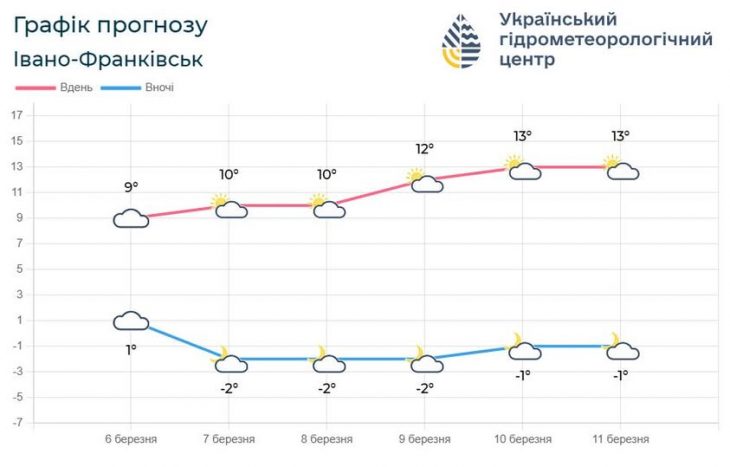 За прогнозом обласного центру з гідрометеорології, опадів не очікується. Вітер буде південно-східним зі швидкістю 5–10 м/с. Температурні показники коливатимуться від нічних морозів (0…–5°C) до денного тепла на рівні +8…+13°C. На високогір’ї Карпат також збережеться плюсова температура — вдень стовпчики термометрів піднімуться до +4…+9°C.