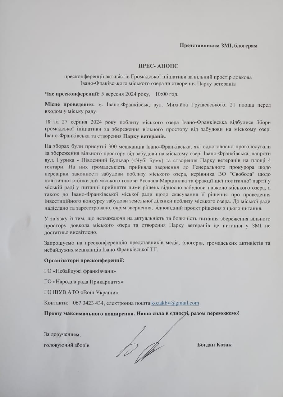Відбудеться пресконференція активістів Громадської ініціативи за вільний простір довкола Івано-Фраківського міського озера та створення Парку ветеранів