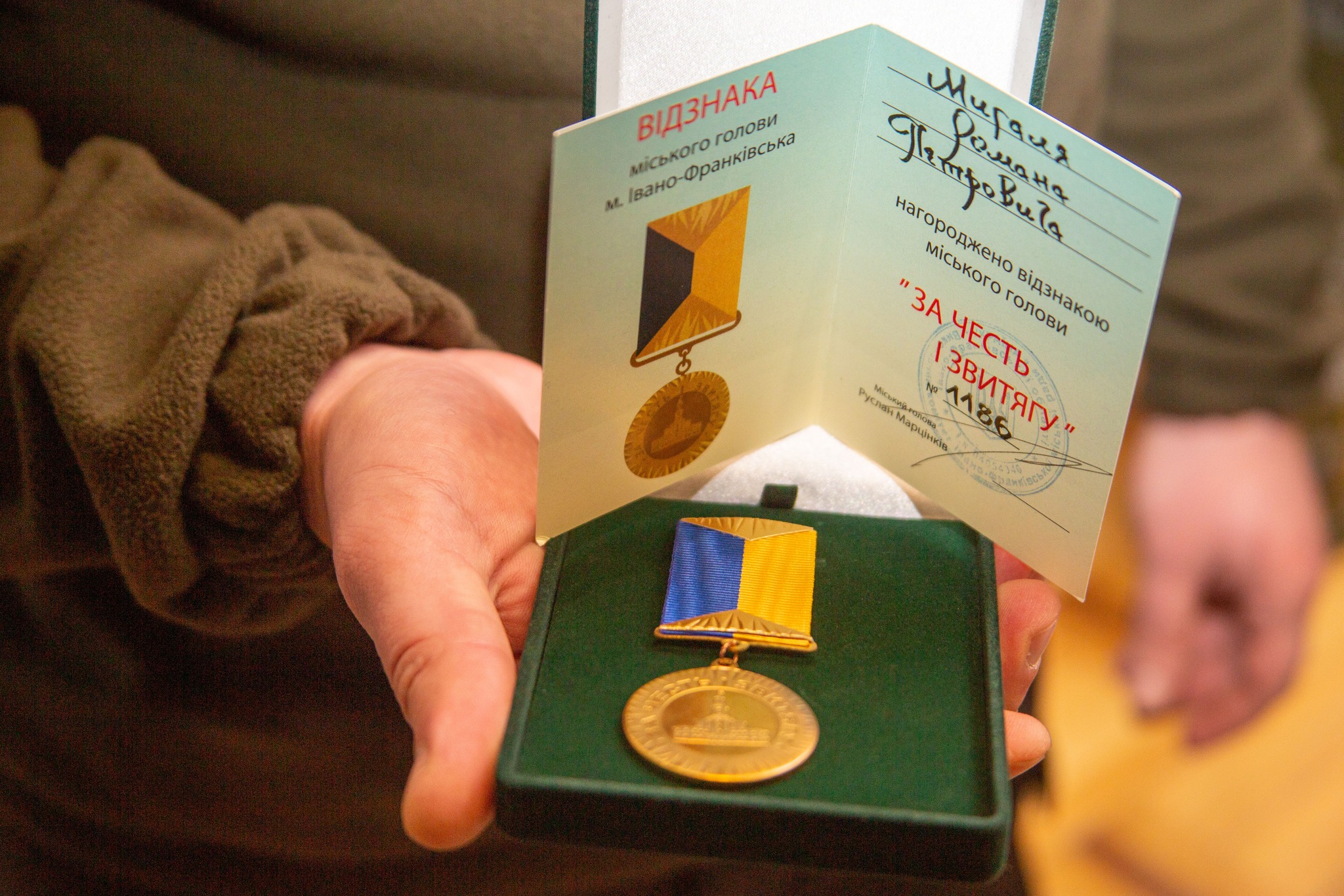 Міський голова Івано-Франківська Руслан Марцінків вручив нагороду «За честь і звитягу» ІІІ ступеня військовому Роману Мигалю.