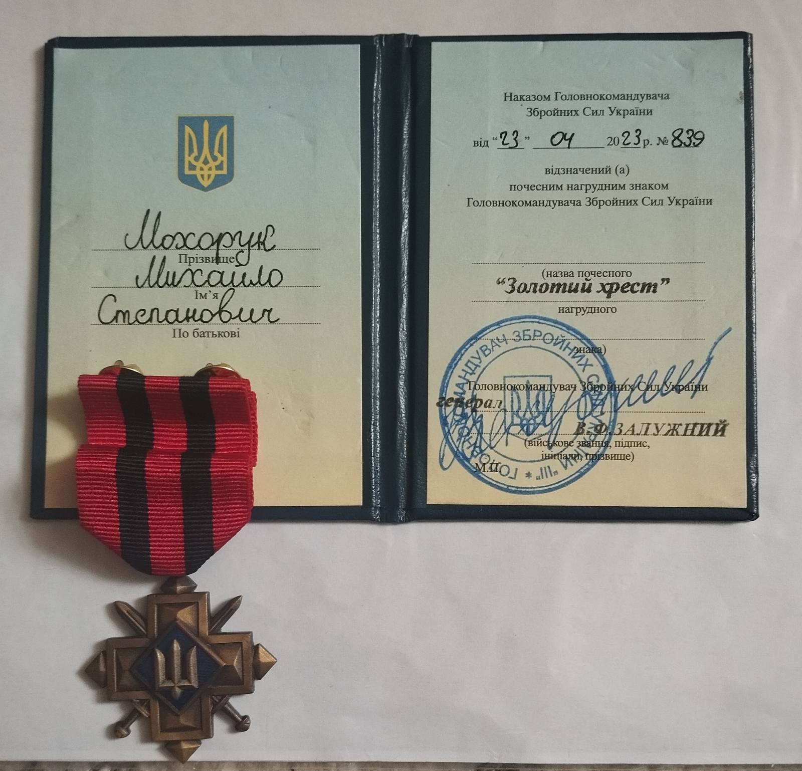 “Вітаємо нашого земляка Михайла Мохорука, мешканця села Топорівці, із нагородою від Головнокомандувача Збройних Сил України Валерія Залужного «Золотий хрест»!” – йдеться в дописі.