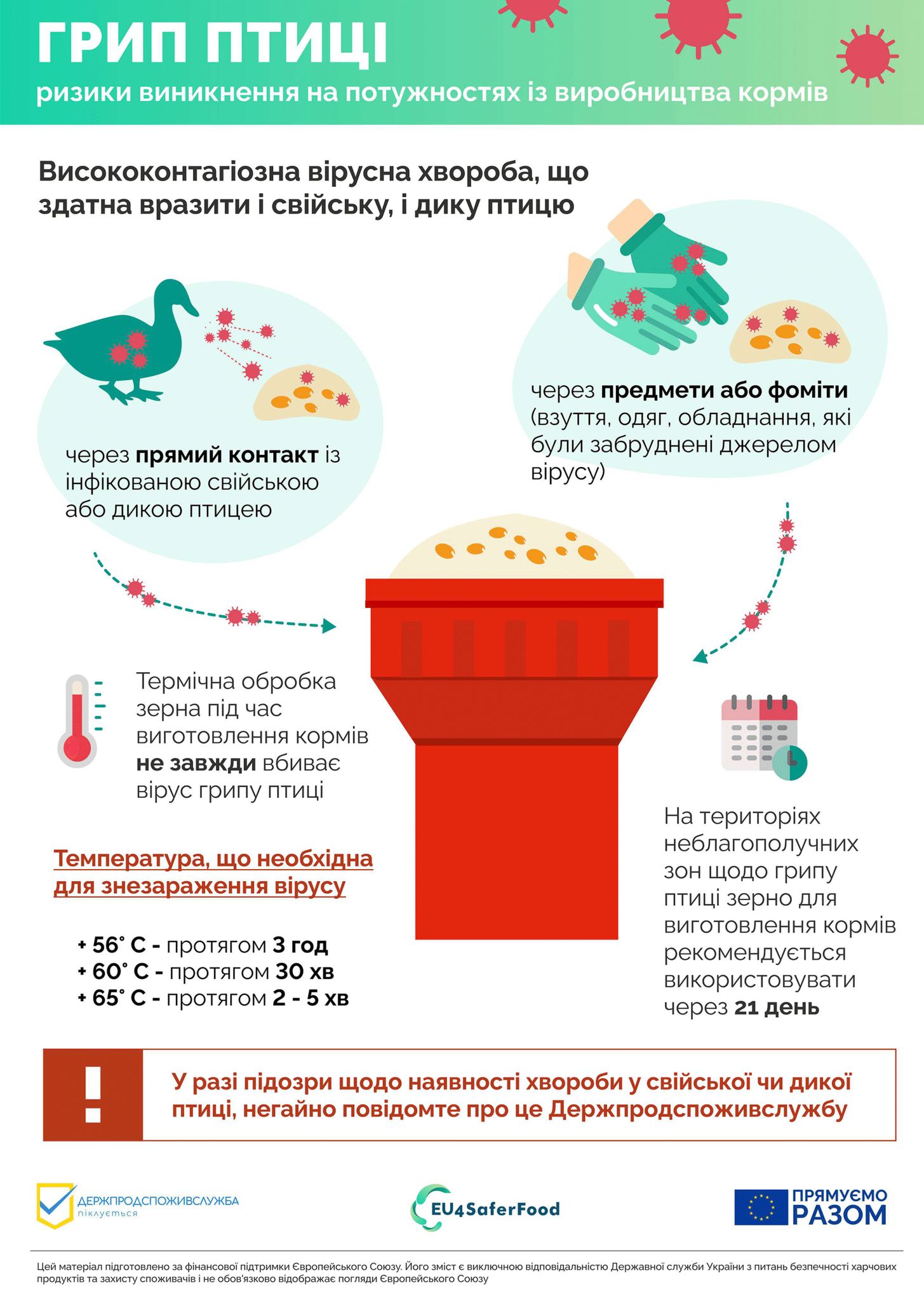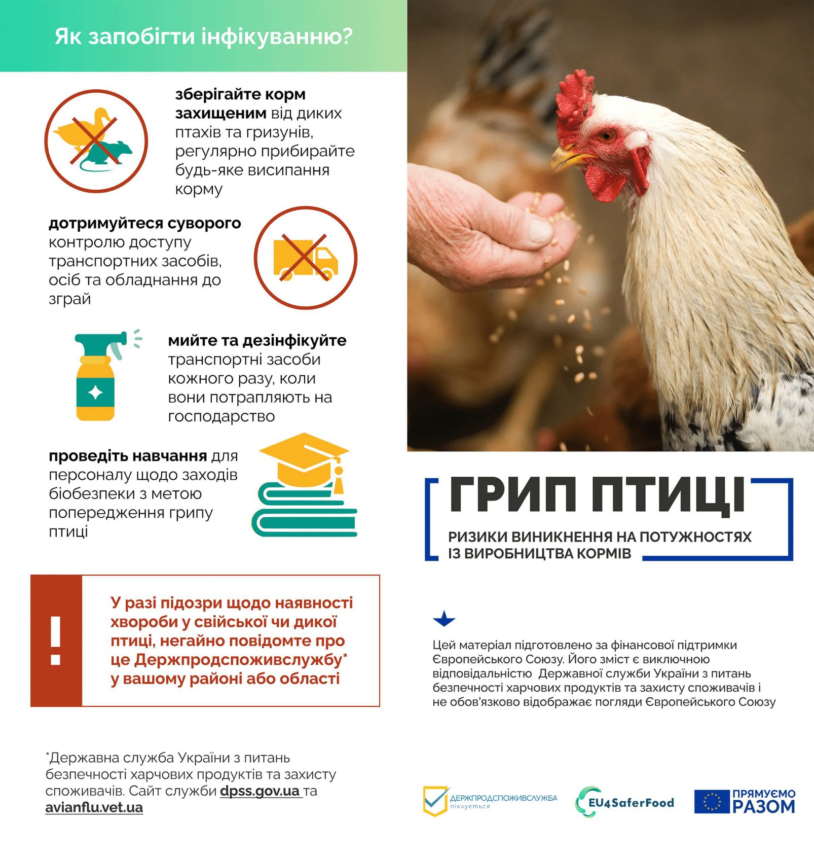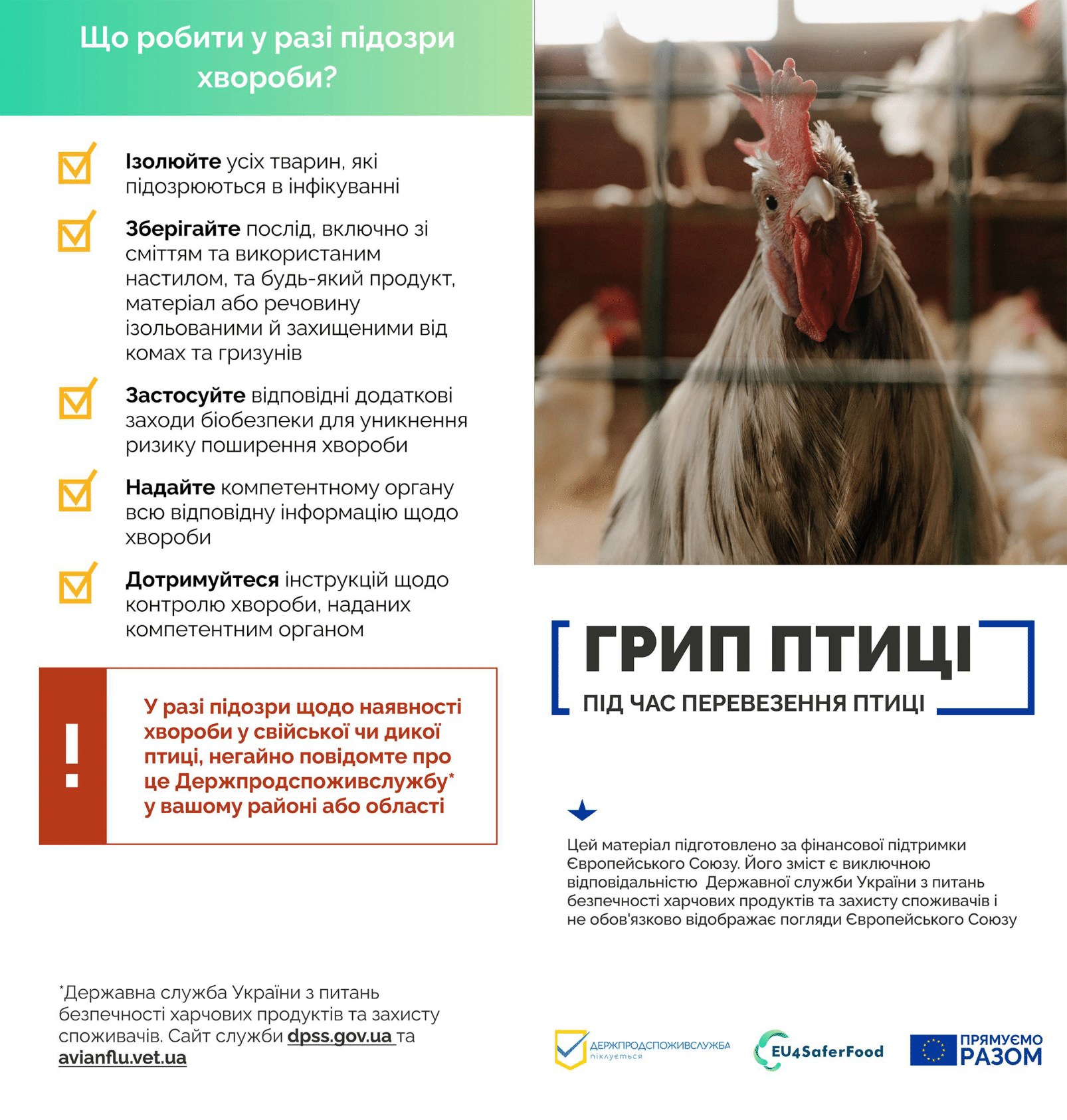 При виявленні перших ознак захворювання чи незвичної поведінки птиці, особливо у випадку масової загибелі домашньої чи дикої птиці, необхідно терміново сповістити територіальний орган Держпродспоживслужби за місцем виявлення такої птиці.