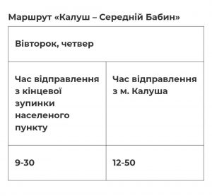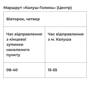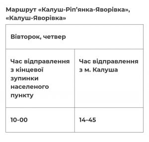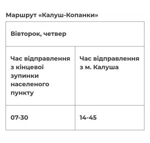 З 10 лютого запроваджуються пільгові перевезення пасажирів до сіл Калуської громади. Приміський автотранспорт, що здійснює безкоштовне перевезення пільгових категорій громадян, пенсіонерів за віком та осіб з інвалідністю курсуватиме у вівторок та четвер.