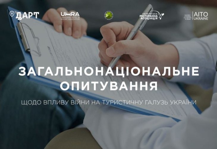 Державне агентство розвитку туризму України спільно з UHRA – Ukrainian Hotel & Resort Association, Асоціацією в’їзних туроператорів України – Association of Incoming Tour Operators of Ukraine, Всеукраїнська асоціація гідів та Українська ресторанна асоціація ініціювали загальнонаціональне опитування щодо наслідків впливу війни на туристичну галузь України.