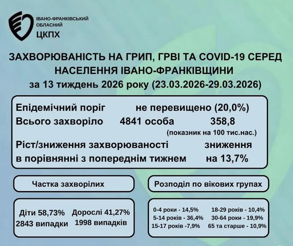 В Івано-Франківській області спостерігається позитивна динаміка щодо поширення сезонних вірусних інфекцій. За останній тиждень рівень захворюваності на ГРВІ, грип та COVID-19 знизився на 13,7%.