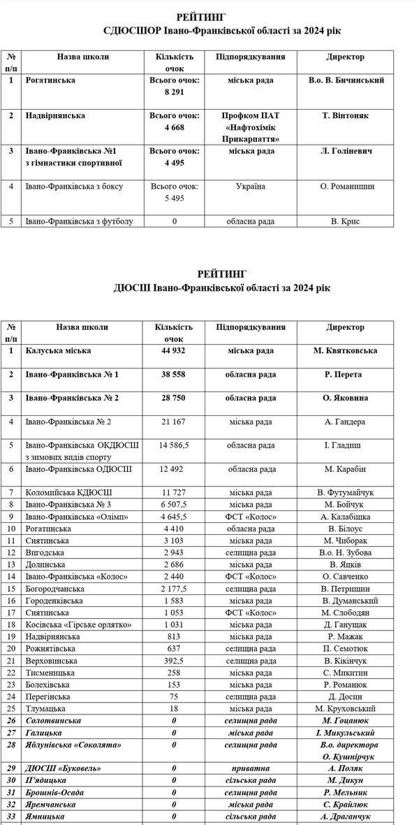 Затвердження рейтингу ДЮСШ усіх типів та форм власності області за 2024-й рік
