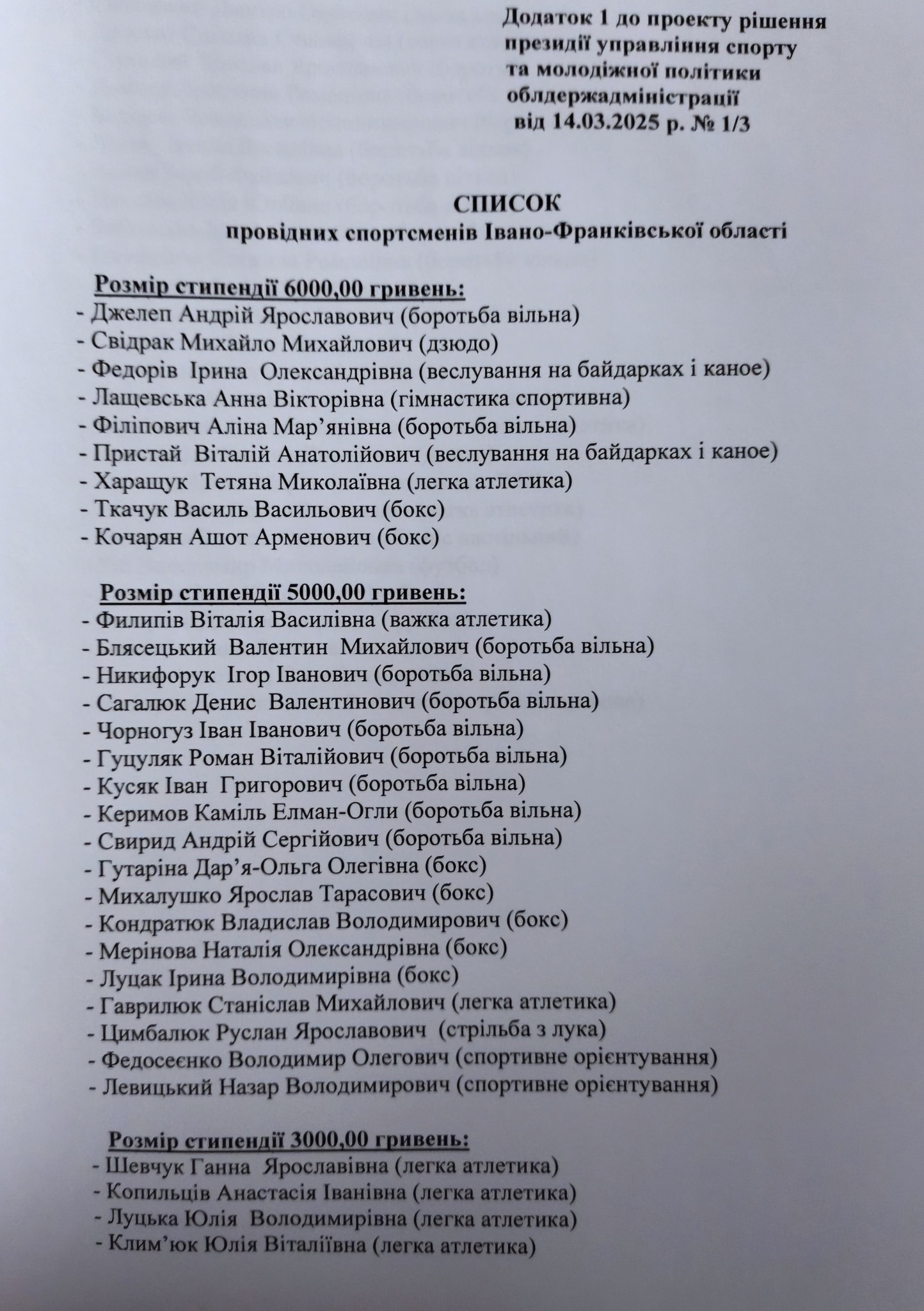 Затвердження рейтингу ДЮСШ усіх типів та форм власності області за 2024-й рік, призначення стипендій кращим спортсменам, фото чого додають, а також погодження плану роботи управління спорту на поточний 2025-й рік.