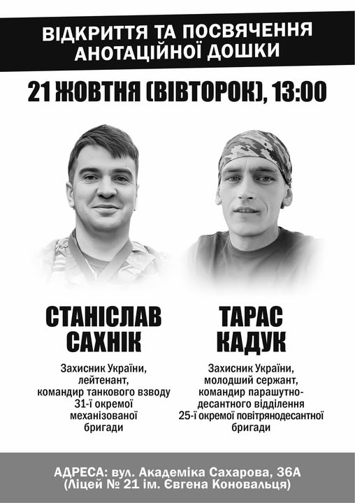 На фасаді Ліцей 21 імені Євгена Коновальця Івано-Франківської міської ради відкриють памʼятні дошки Станіславу Сахніку та Тарасу Кадуку — випускникам навчального закладу, які віддали життя за свободу та незалежність нашої держави.